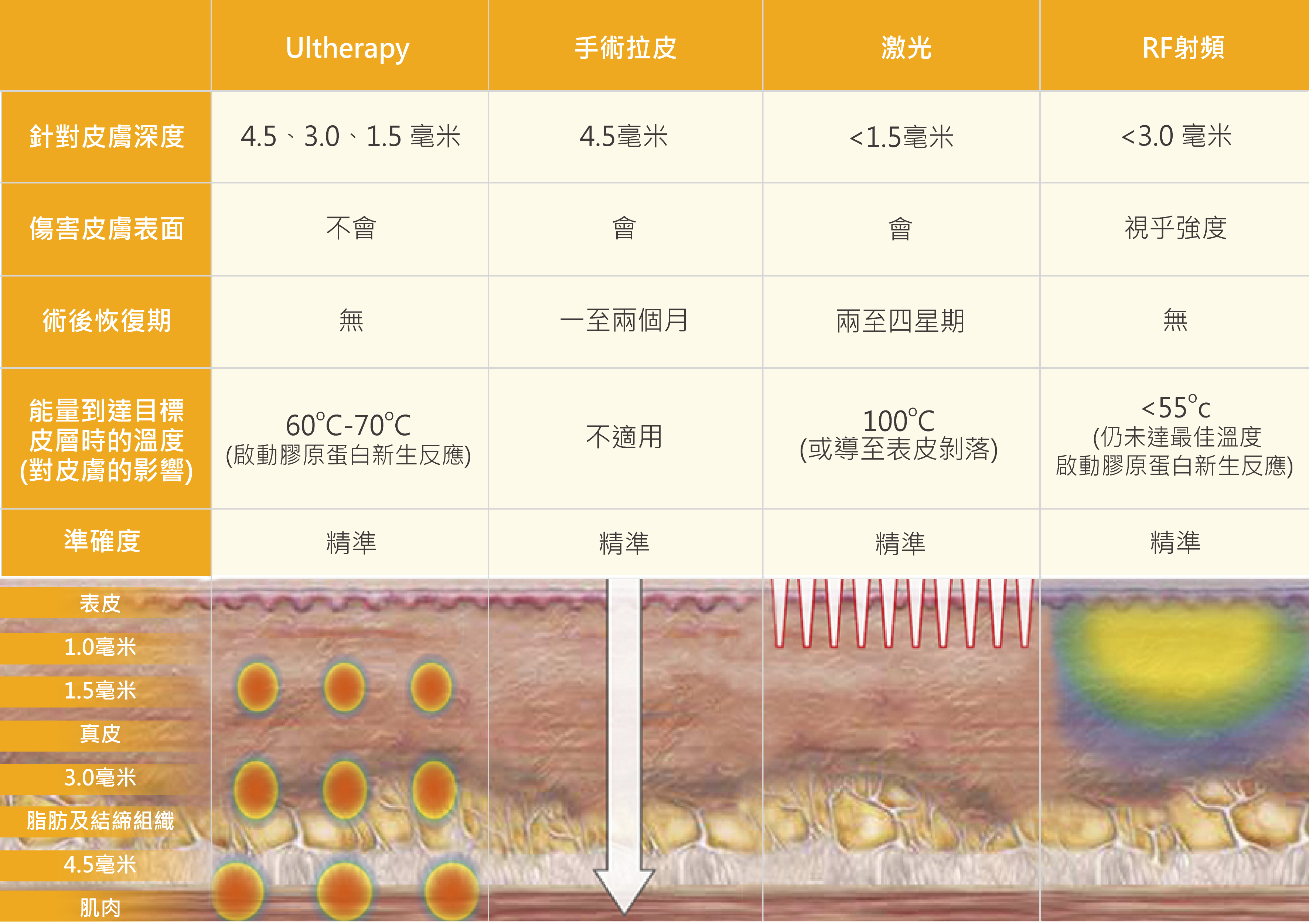 Ultherapy®以聚焦超聲波釋出3段波長—4.5mm、3.0mm、1.5mm,精準直達肌腱膜、真皮底層及真皮淺層,重點拉提、收緊,重整肌底緊密結構,強化肌腱膜承托力。