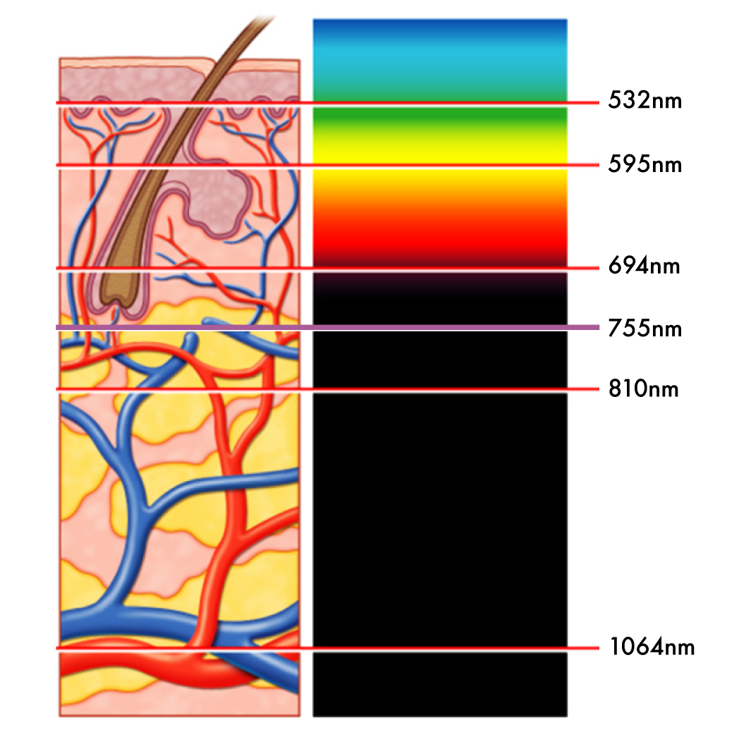 經醫學證實,755nm激光波長對黃皮膚及白皮膚最有效。