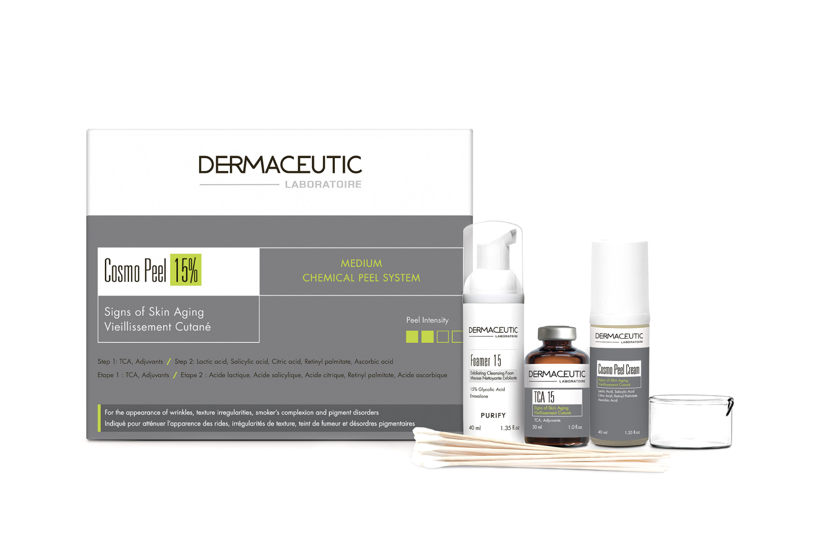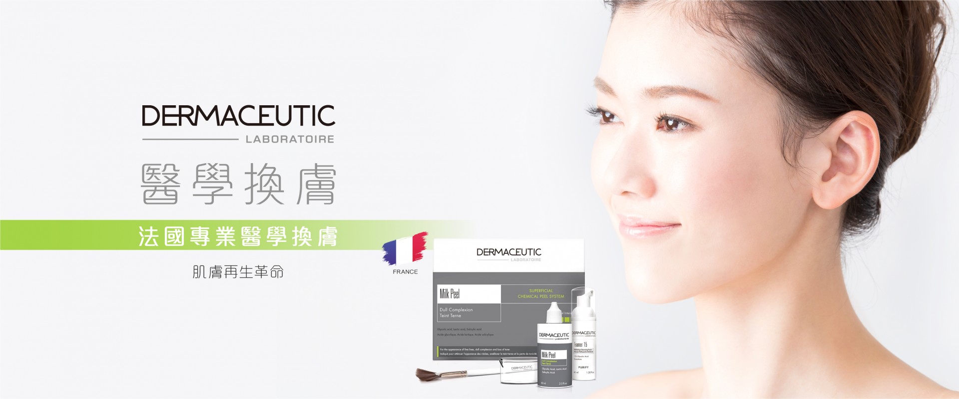 法國 DermaCeutic 醫學專業換膚品牌由一群資深的法國皮膚專科醫生於90年代創立。科研人員經過多年不懈臨床研究,終於研發出新一代醫學專業換膚系統。DermaCeutic 針對不同膚質研製出相應的換膚系統,切合不同需要,包括Milk Peel、Cosmo Peel等,達至前所未有的理想效果,至今全球已有超過50多個國家使用。