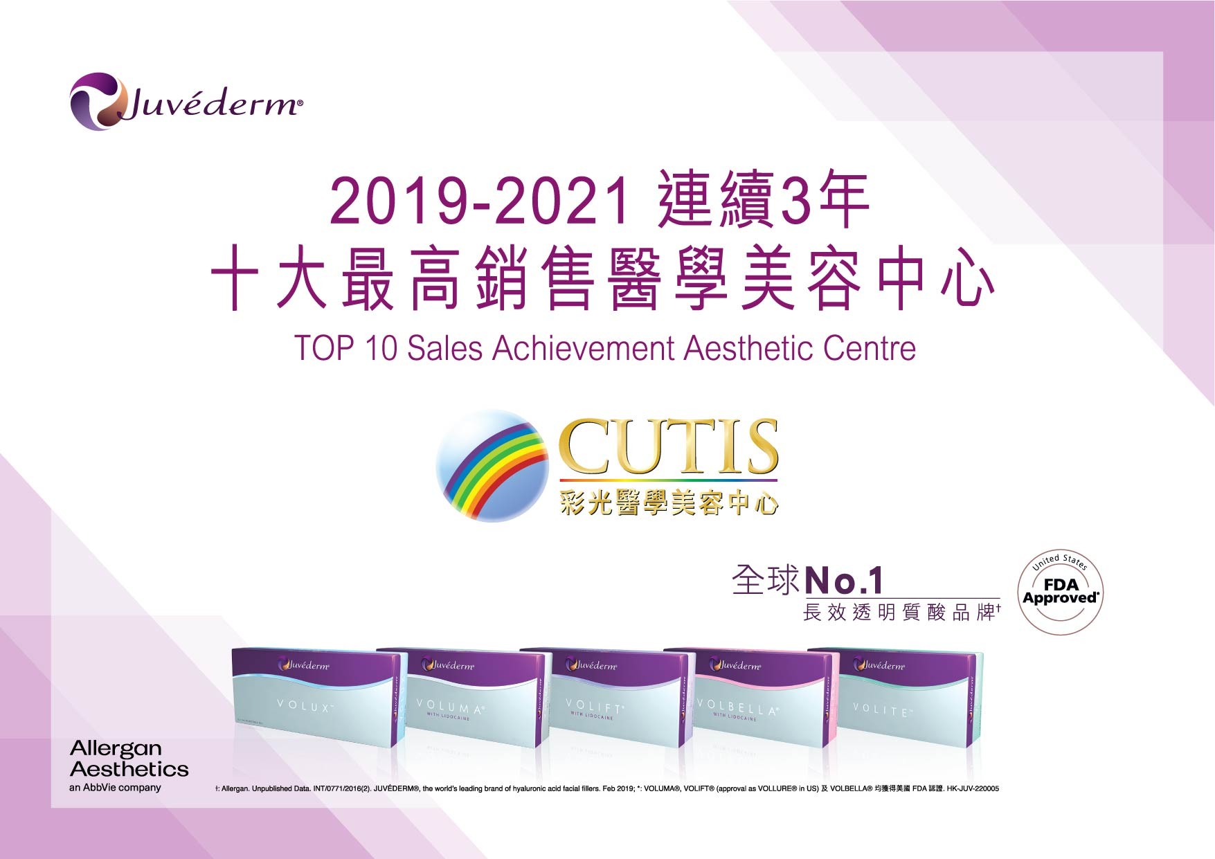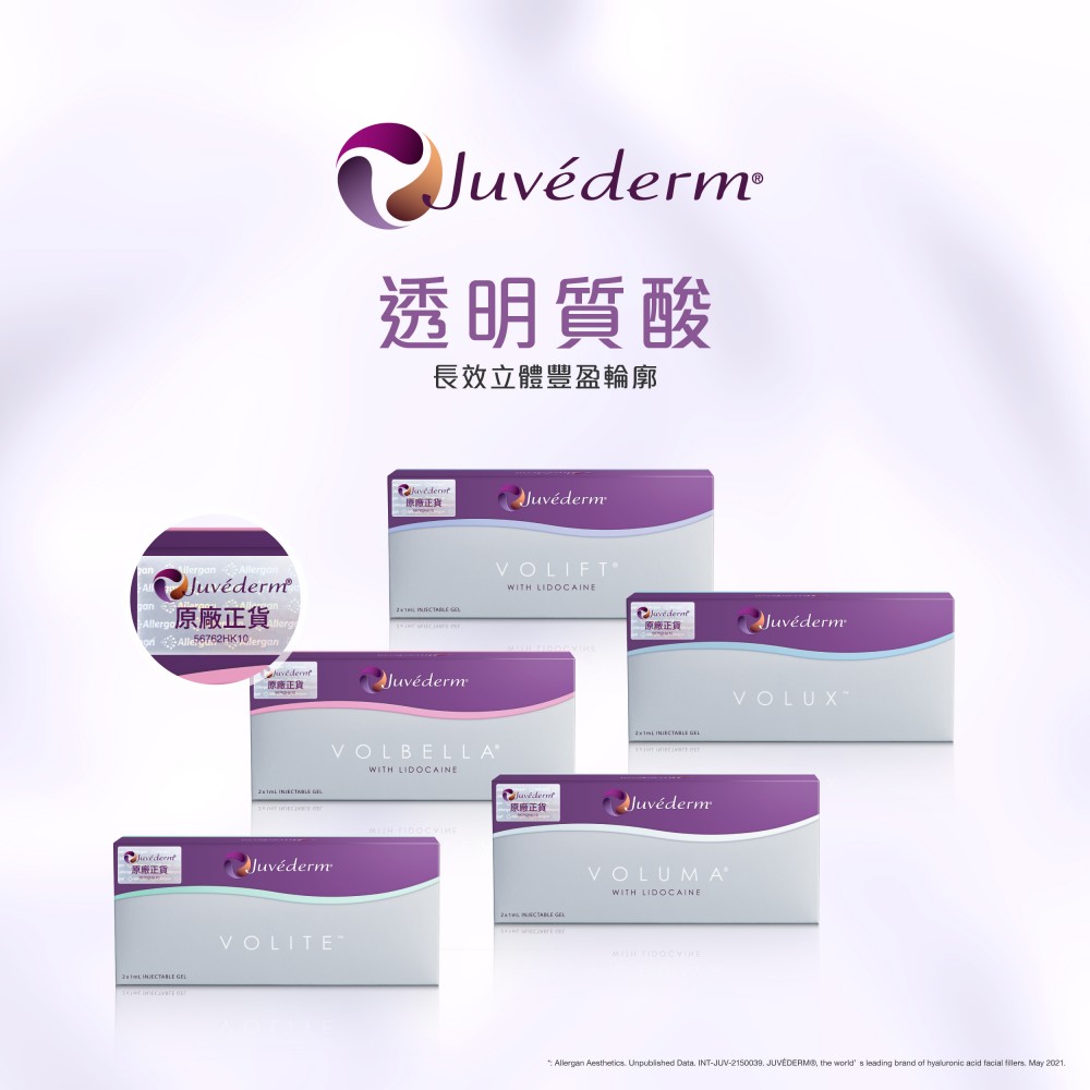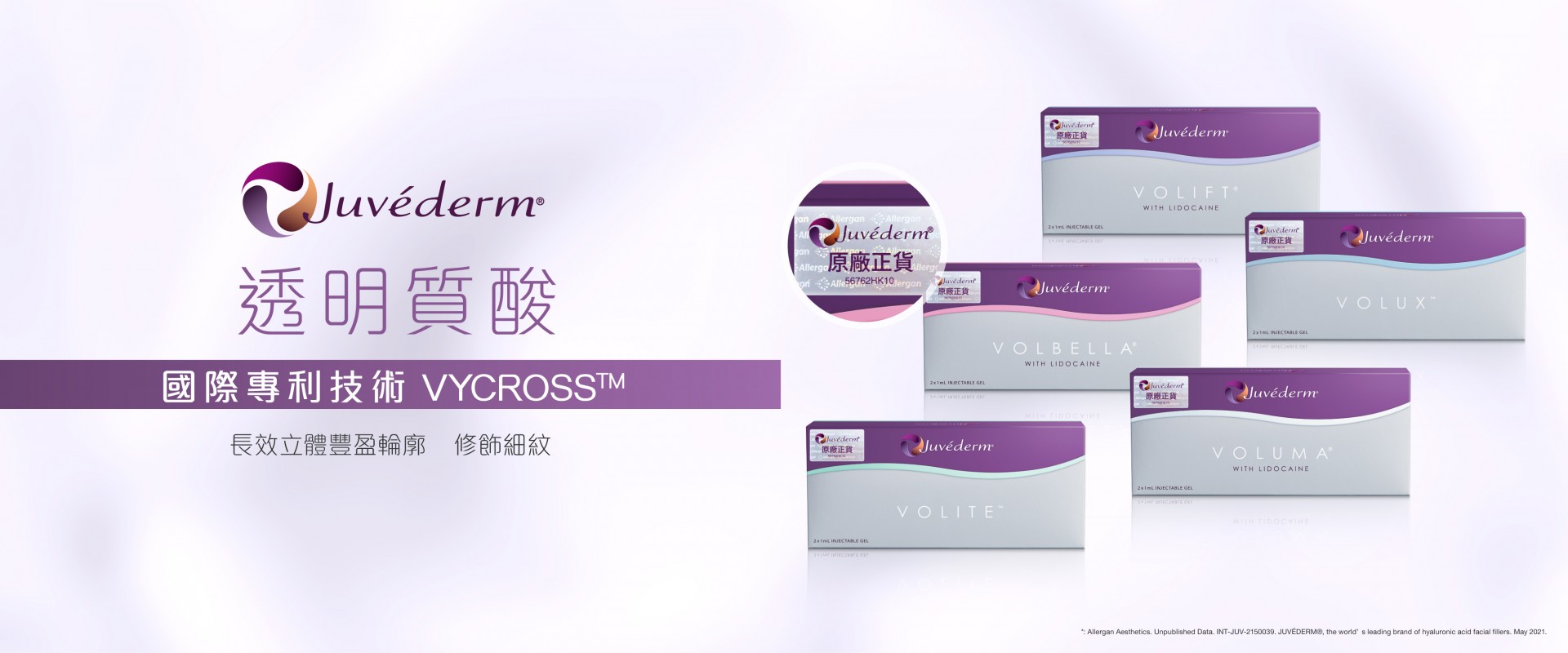 Juvederm 於法國生產, 獲歐盟(CE)及美國食品及藥物管理局(FDA)認證。由透明質酸 Hyaluronic Acid 天然多醣體製造而成,具幼滑及高凝聚力的配方。可鎖住水份,保濕皮膚,增加皮膚密度並改善質感。獲專利 Hylacross™科技帶來的物理特質,包括凝聚力、支撐力及柔順度。重點針對面部因流失膠原蛋白及彈性纖維而凹陷的位置,再依據特定的順序,從顴骨至下巴位置配合 Juvederm 系列的透明質酸產品進行療程,改善局部位置的豐盈度及平滑度,全面優化面部輪廓。