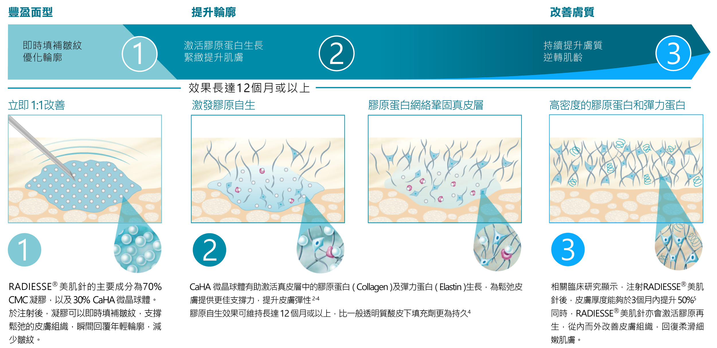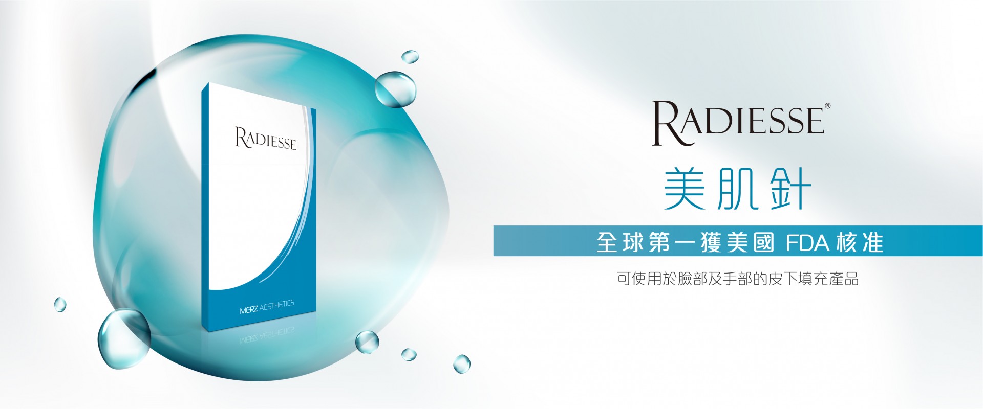 Radiesse® 美肌針是一種可被人體完全代謝分解的皮下填充劑,有助提升輪廓,同時促進皮膚自身膠原蛋白生長,改善老化。Radiesse® 美肌針已獲得美國食品及藥物管理局FDA,歐盟CE認證以及香港衛生署核准;是全球第一獲美國FDA核准能夠使用於臉部及手部的皮下填充產品。