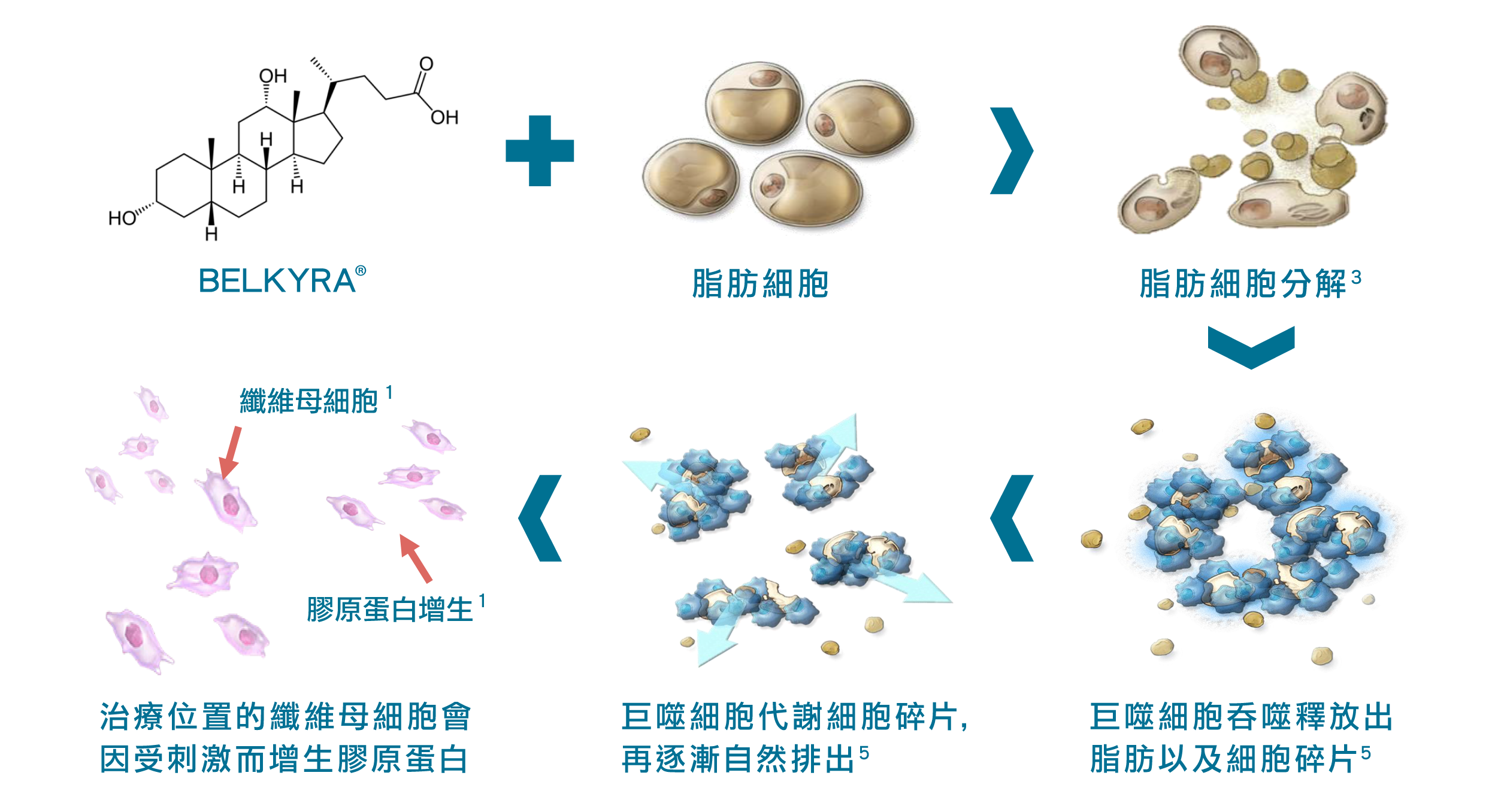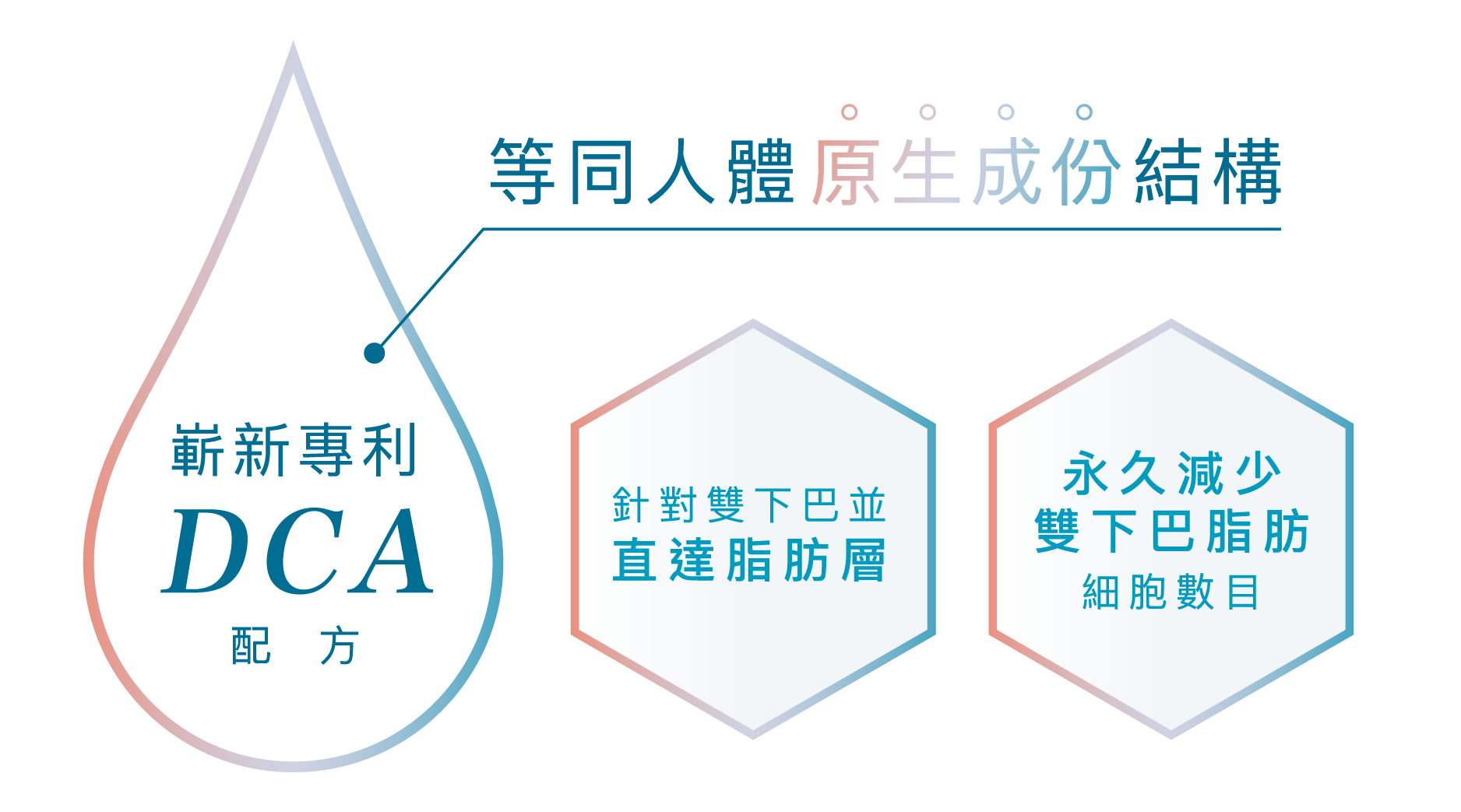 去氧膽酸 Deoxycholic Acid (DCA) 注射針劑 - 注射至皮下脂肪時,DCA會破壞脂肪細胞的細胞膜,導致不可逆轉的脂肪細胞分解。