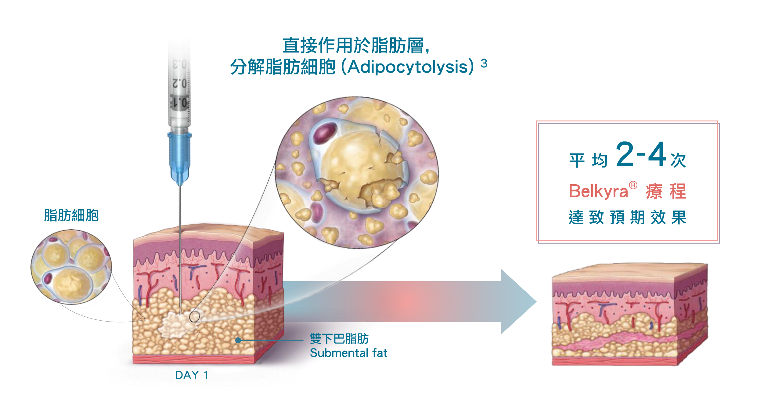 Belkyra溶脂針能高效定點針對脂肪雙下巴。科研實證,有效永久消滅雙下巴脂肪,讓你擺脫雙下巴所帶來的煩惱。3-6作為世界級首創的溶脂配方,Belkyra®內含專利成分去氧膽酸deoxycholic acid (DCA),透過直接作用於治療位置的脂肪層,破壞脂肪細胞的細胞膜,導致不可逆轉的脂肪細胞分解。6