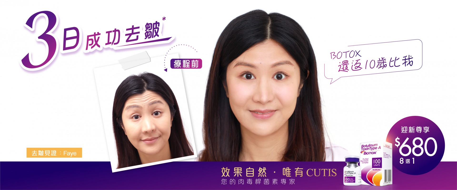 由專業人士分析你的紋路分佈,用極幼細的注射針,將肉毒桿菌素注射於臉上最適當的數個位置,並不會到達全身或累積於人體內。10分鐘的簡單療程,注射後2-3天內開始發揮功效,表情紋得到明顯的改善;約第7天即有助撫平難看的表情紋。療程後不留明顯痕跡,即日可回復正常生活。