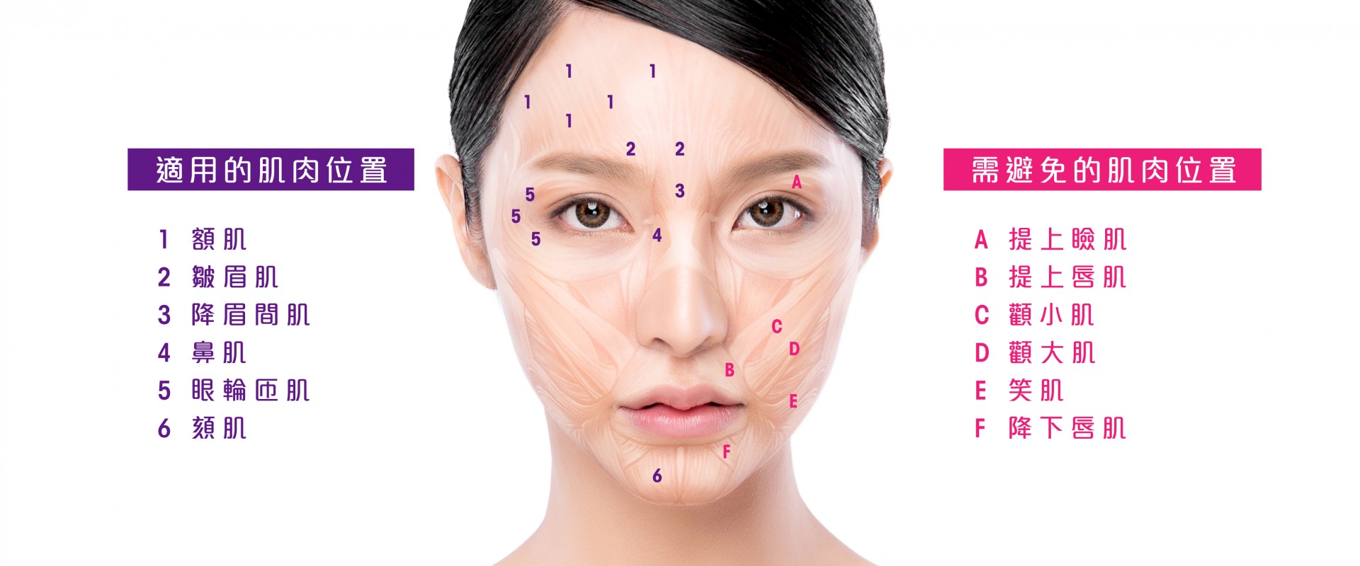 當使用肉毒桿菌素於面部肌肉時,可以阻隔神經末梢釋放乙醯膽鹼,令面部肌肉收縮能力減弱,有效放鬆導致動態紋的面部肌肉,大大減少紋路的出現,達到高效去皺效果。