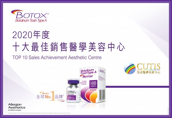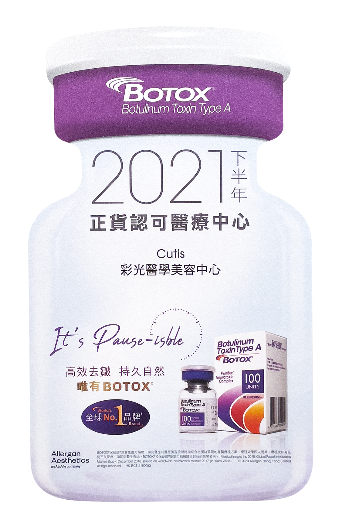 全球銷量 No.1 品牌,獲首個美國 FDA 認證超過 30 年。它是一種從細菌提煉出的高純度蛋白質,可用於去皺美容療程的肉毒桿菌素,能阻隔神經末梢的訊息傳遞,從而令繃緊的肌肉放鬆,快速而有效地撫平面上動態紋。現時超過 100 個市場銷售,3500 份醫學文獻及研究支持,獲首個國際級安全認受。