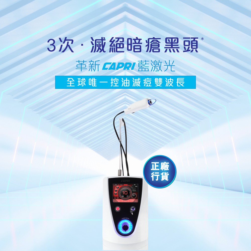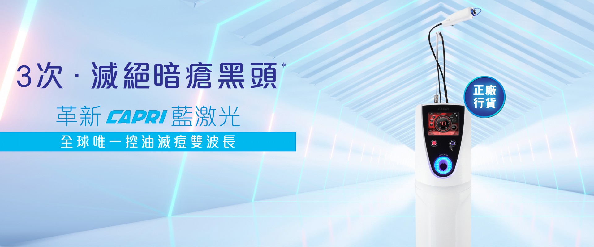 CAPRI 藍激光是最新非侵入式激光,擁有全球唯一針對暗瘡的雙波長(1450nm+450nm),配合 ATCD 冷媒減痛技術,有效、安全及舒適地針對治療暗瘡及皮脂腺問題,獲韓國 KFDA 及台灣 TFDA 認證。「1450nm波長」主要控油,加熱和破壞皮脂腺,減少油脂分泌。「450nm波長」用來殺菌,殺死痤瘡桿菌和抗發炎。