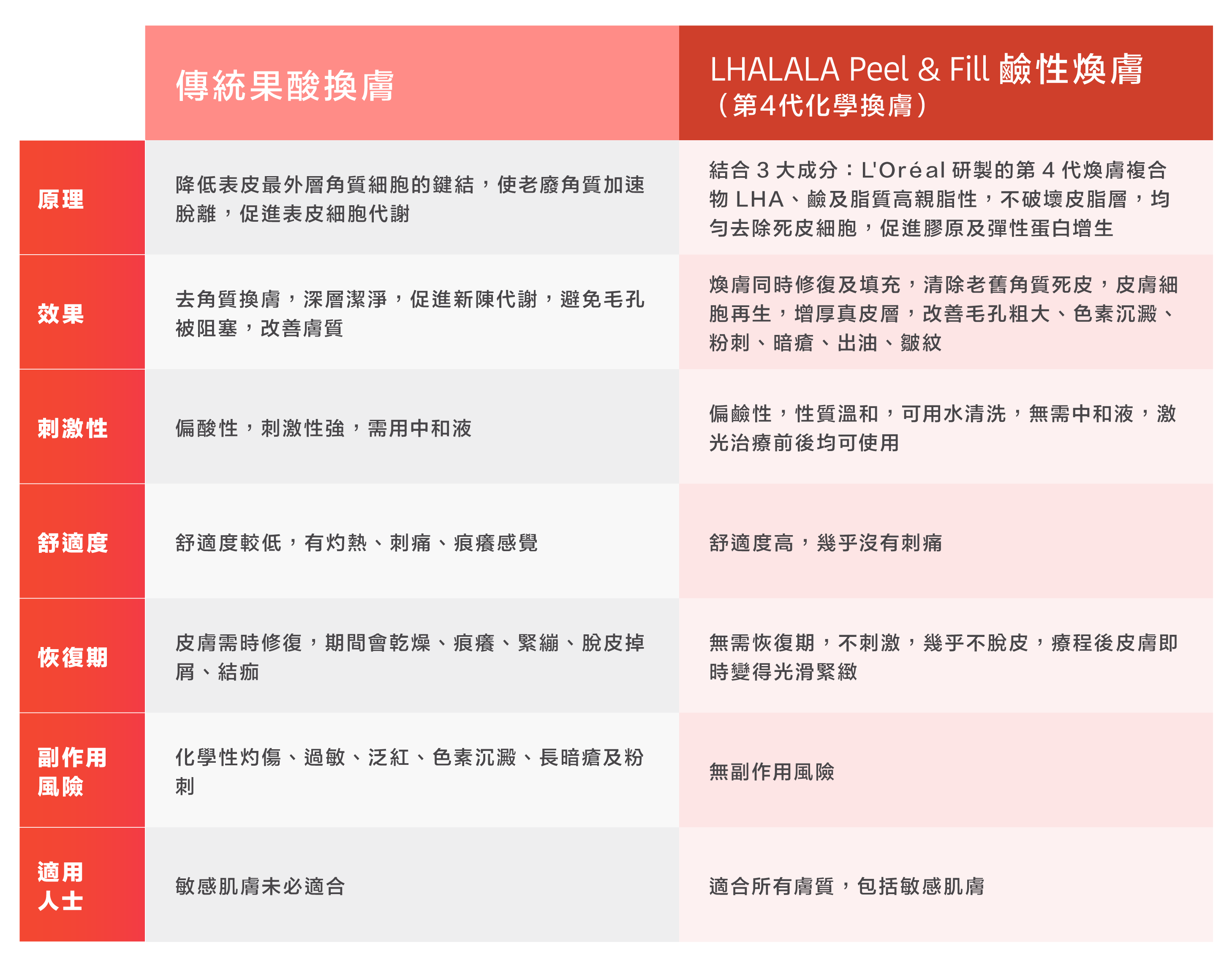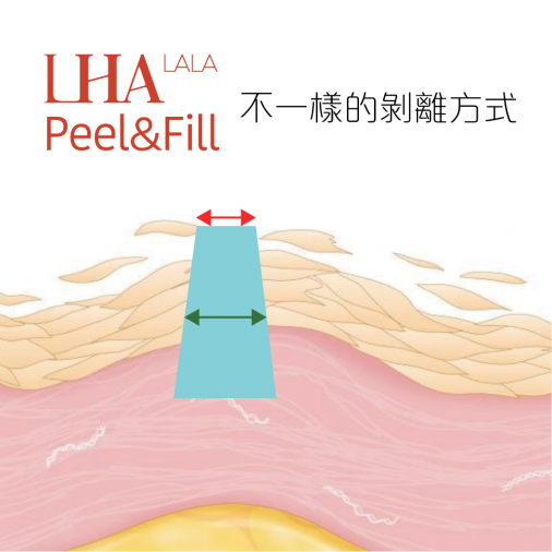 LHALALA Peel & Fill鹼性煥膚是第四代化學換膚配方,結合三大成分:L'Oréal研製醫學級煥膚複合物LHA(Lipo hydroxy acid脂羥基酸)、獨特鹼性成分HP-Sol、脂質,有效穩定滲透肌膚細胞,柔和深層清理細胞間裂隙,亦不會對角質細胞損害,加強角質細胞抵禦紫外線、細菌病毒的防禦功能。配方具親脂性,不破壞皮脂層,均勻去除死皮細胞,促進膠原及彈性蛋白增生,達到煥膚同時修復及填充,皮膚即時變得光滑緊緻。性質溫和,不刺激,敏感肌膚適用,無需恢復期。