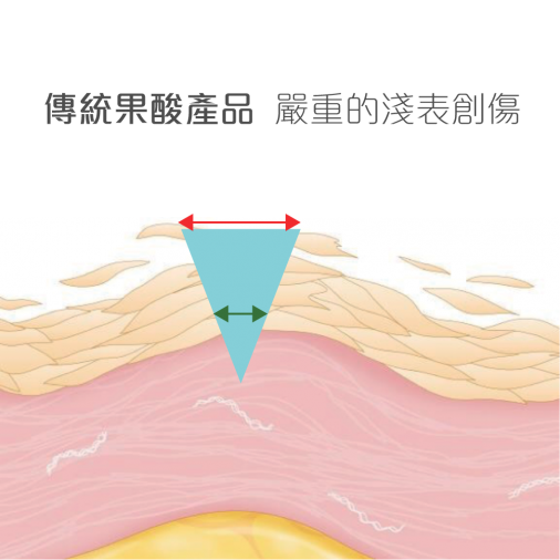 傳統果酸難以均勻吸收,對皮膚表面的刺激作用(紅色箭頭)大於皮膚再生和重塑作用(綠色箭頭),產生不平衡現象,導致表面較易有顯著創傷,而功效卻不大